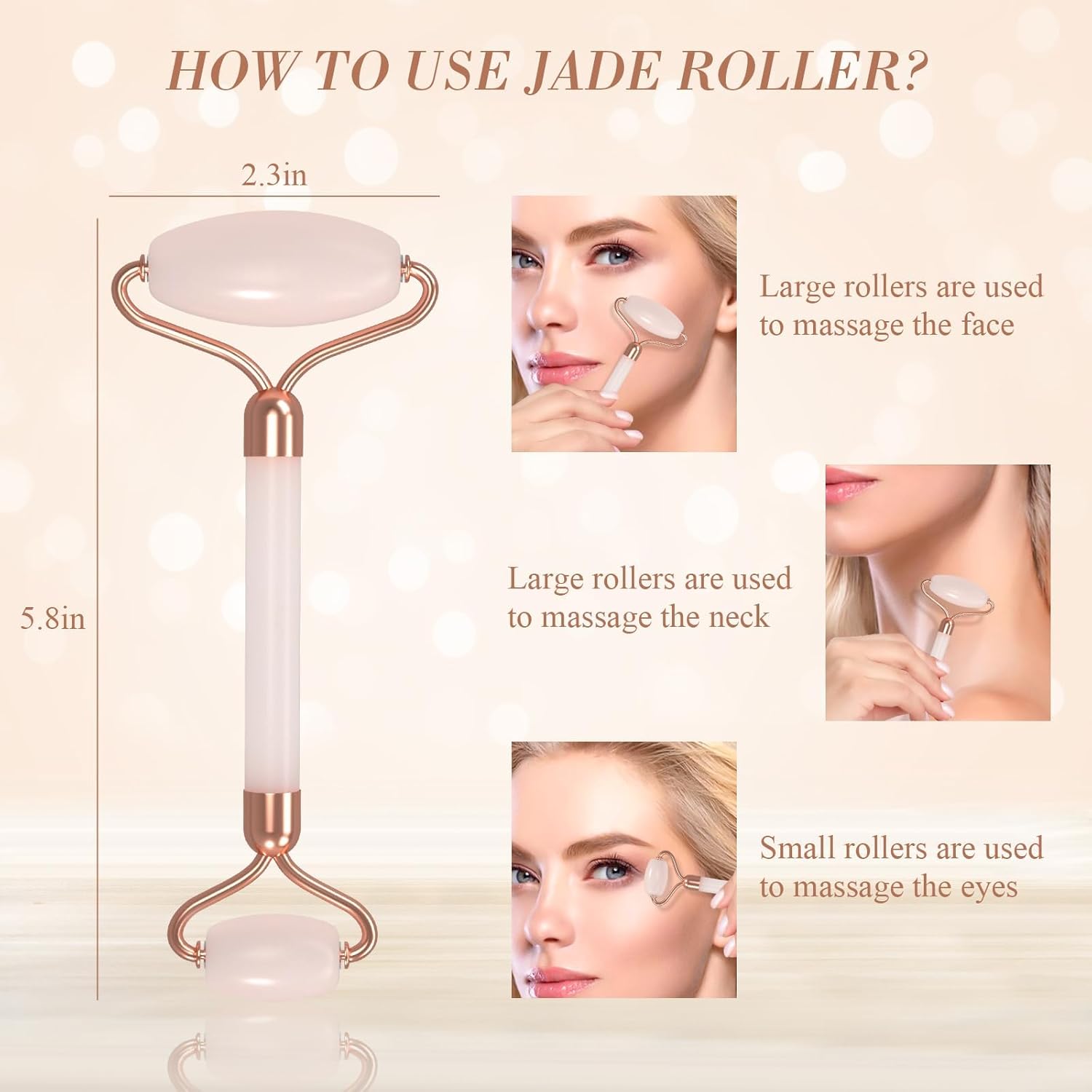 Start with clean skin and apply your favorite serum or moisturizer. Gently roll upward and outward from the center of your face, using light pressure. Use daily for best results.